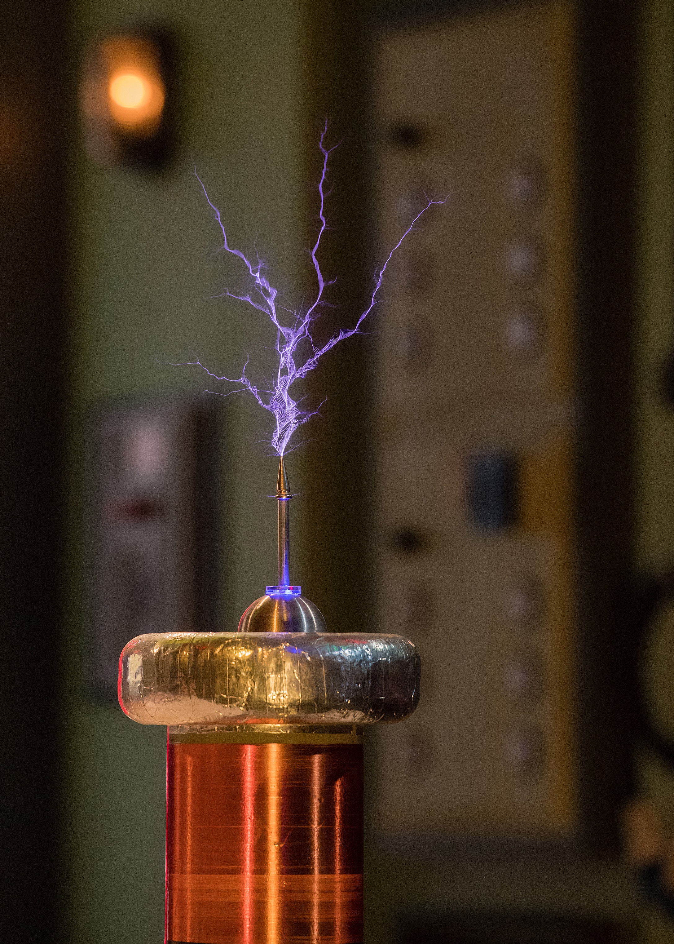 Tesla coils are the most common high voltage device we get, are essentially a large transformer. Near the bottom of the tesla coil is a radio frequency generator either electronic or mechanical, driving a primary winding with a small number of turns. The Secondary coil (the tall one) has a much larger number of turns of around 800-2000 turns typically. And at the top if this, a topload where the high voltage comes out. We get tesla coils of all sizes from a 50mm high, to over 2M tall at the Gaussfest.