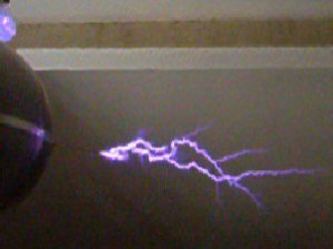 coupling. I do have to run with my interrupter to keep the input current draw down as 7K BPS gives me 2KW average and I don't think the IGBT's would stand that sort of abuse. The streamers from the coil are "curly" and sword like at high BPS, not the sort of streamers you would expect from a disruptive coil at all. The coil also "found" some neon tube I had stored along the roof beams, as I wound up the power the whole place went RED. I thought some thing had blown up, but I'd managed to light up all three 3' neon tubes to almost full brightness. The Blue globe in the background to this picture is a normal light bulb about 70cm away. (turned off) giving a pretty display all of its own. The electronic one failed, I'm not too sure why 🙂 . Click the picture for a movie of the AD-OLTC running at high BPS. |
